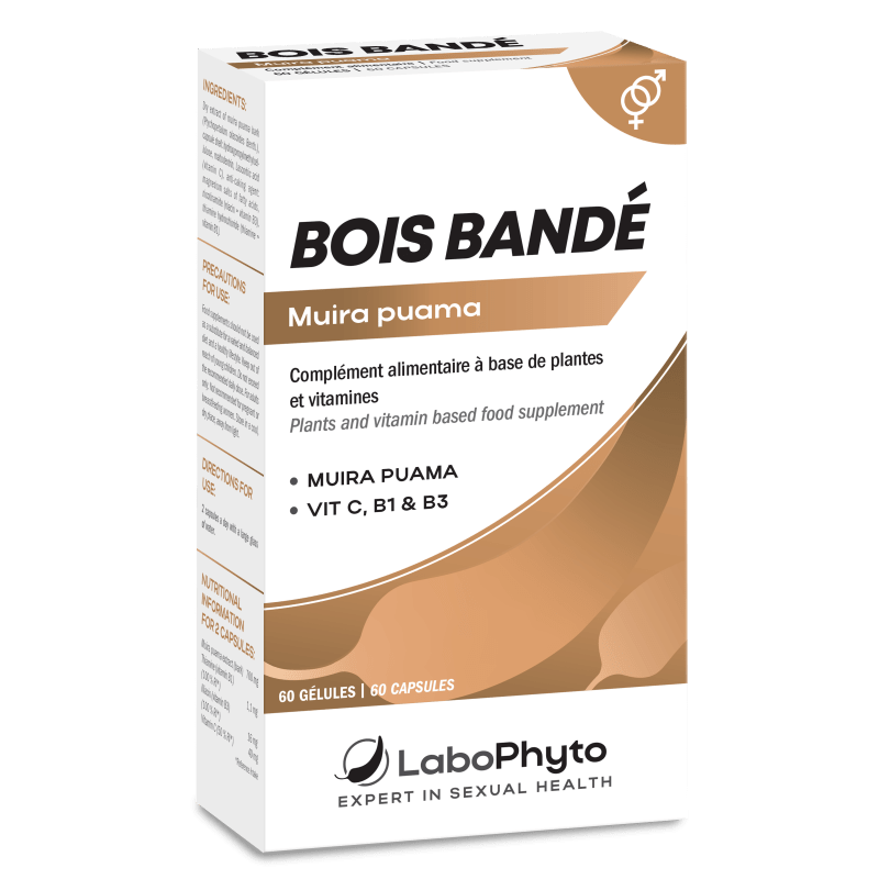 Vous n'êtes pas sans connaître le célèbre "bois bandé" qui depuis des dizaines d'années favorise les relations sexuelles. En boîte de 60 gélules, ce bois bandé s'adresse aux hommes comme aux femmes. Augmentation du désir sexuelle et maintien de libido, le bois bandé aidera également les femmes dans le désir pré et post ménopause.Plus d infosLe Muira Puama est un arbre originaire du Brésil, on le trouve dans la forêt amazonienne. Ses racines, son écorce et son bois sont utilisés en médecine traditionnelle au Brésil et en Guyane. Considéré depuis longtemps comme ayant des propriétés aphrodisiaques, les créoles de Guyane l ont surnommé bois bandé . Les extraits de cet arbre mythique ont en effet des propriétés bénéfiques sur le tonus sexuel, l érection et la libido.Conseils d'utilisation : 2 gélules par jour avec un grand verre d eau. Gélules végétales Contenance : 60 gélules Poids net : 32,7 g Caractéristique : complément alimentaire Composition : Muira Puama (écorce) Dosage pour 2 gélules : Muira Puama (écorce) 900 mgFabrication française : produit conforme aux textes européens relatifs aux allégations nutritionnelles et de santé autorisées. Les compléments alimentaires ne peuvent être substitués à un régime alimentaire varié et équilibré. À consommer dans le cadre d un mode de vie saine. Ne pas dépasser la dose journalière recommandée. Ne pas laisser à la portée des enfants. Ne doit pas être utilisé par des femmes enceintes ou allaitantes, et par les personnes sous traitement médical. Pour votre santé, mangez au moins cinq fruits et légumes par jour, pratiquez une activité physique régulière, évitez de manger trop gras, trop sucré, trop salé, évitez de grignoter entre les repas. www.mangerbouger.fr.