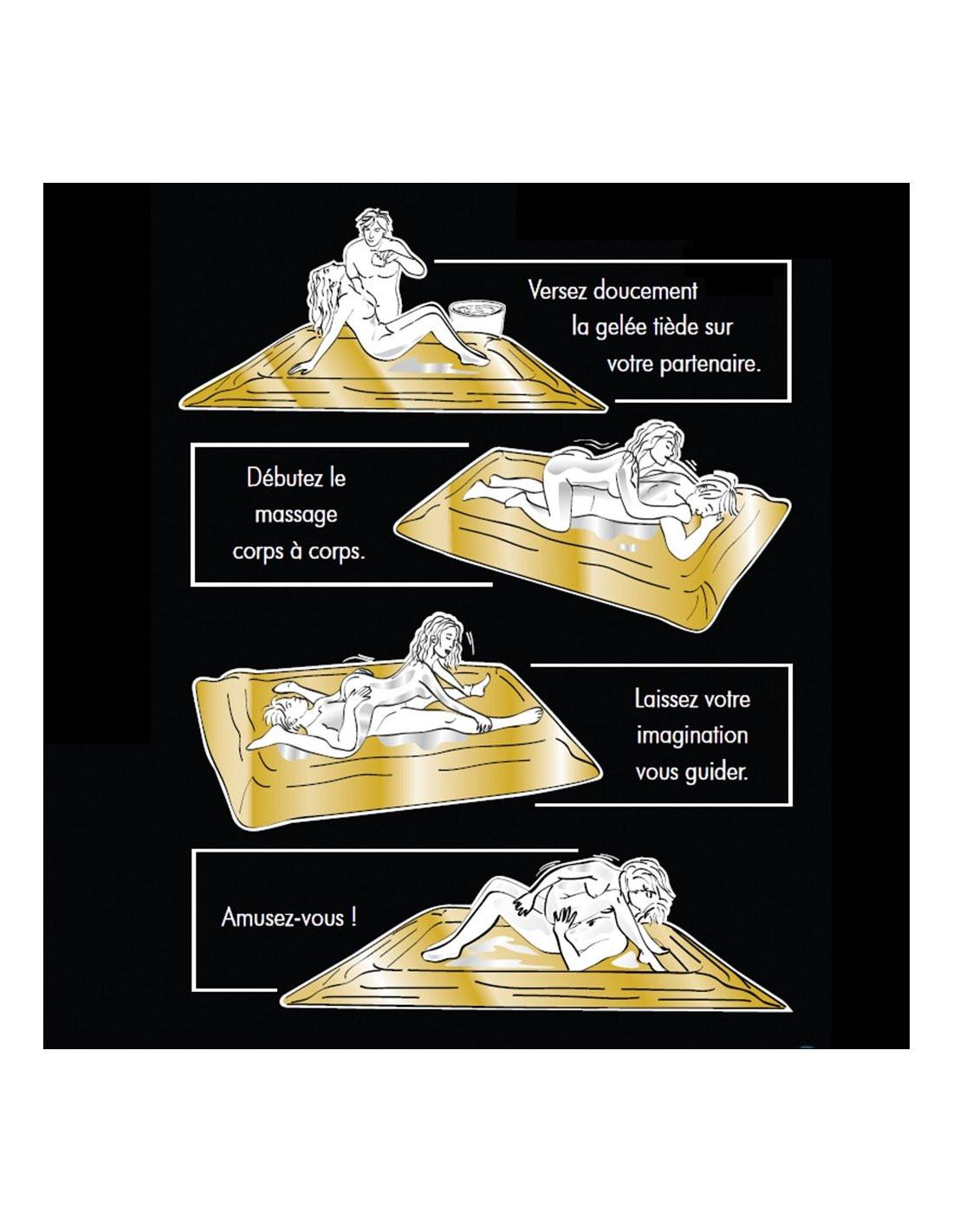 Le massage oriental corps à corps se traduit par une expérience sensuelle totalement amusante où les corps, presqu en état d apesanteur, glissent allègrement l un contre l autre dans un mouvement de va-et-vient.La gelée, versée en grande quantité sur deux corps nus, crée un effet enivrant et aphrodisiaque. Rends la peau soyeuse et transforme les caresses en touchés sensuels.Étape 1: Pliez en deux une couverture épaisse et étendez-la sur le sol.Étape 2: Roulez les serviettes de bain en rondin sur le sens de la longueur et disposez-les autour de la couverture pour former un rectangle.Étape 3: Dépliez la couverture dorée étanche et étendez-la sur le tout. Prenez soin d aplanir le centre pour épouser le contour des rondins et former un bassin.Étape 4: Versez 3.5L d eau chaude du robinet et la bouteille #1 dans le récipient.Étape 5: Ajoutez la bouteille #2 et bien mélanger. Donne 4L de gelée. Versez doucement la gelée tiède sur votre partenaire. Débutez le massage corps à corps. Laissez votre imagination vous guider. Amusez-vous!Les instructions sont illustrées sur le panneau frontal de la boîte.Ingredients (I.N.C.I.): Bottle/Bouteille #1: Demineralized Water/Eau déminéralisée (Aqua), Acrylates / C10-30 Alkyl Acrylate Crosspolymer, Glycereth-2 cocoate, Artificial Flavor/Saveur artificielle (Aroma), Benzoic Acid, Sodium PCA, DMDM Hydantoin, Aloes Vera (Aloes Barbadensis Leaf Juice), Sodium saccharin. Colors for/Couleurs pour : EXOTIC FRUITS/FRUITS EXOTIQUES: FD&C Blue/Bleu #1 (CI 42090). MELON-MANGO/MELON-MANGUE: FD&C Yellow/Jaune #6 (CI 15985). STRAWBERRIES & CHAMPAGNE/ FRAISES ET CHAMPAGNE: FD&C Red/Rouge #40 (CI 16035). Bottle/Bouteille #2: Demineralized Water/Eau déminéralisée (Aqua), Glycerin USP/Glycérine USP, Triethanolamine.