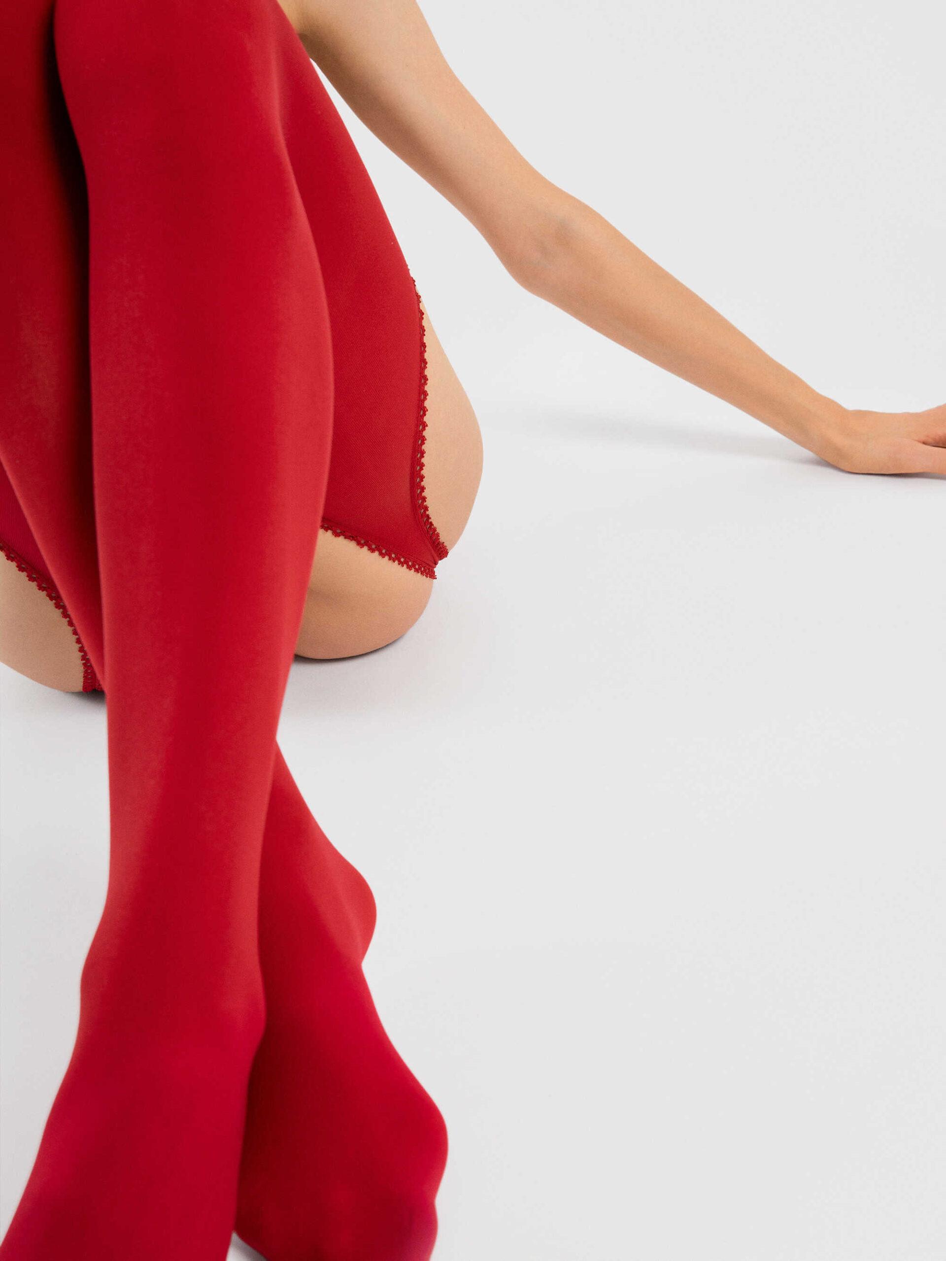 Séduisant bas Rouge. Ouverture arrondi et sexy au niveau des cuisses. Composition : 82% Polyamide, 16% Élasthanne