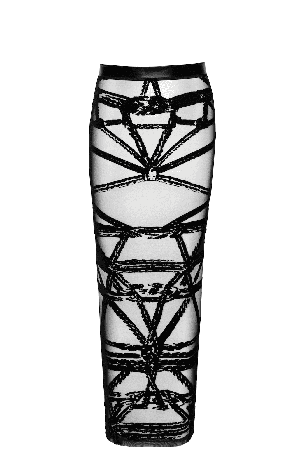 Une jupe en tulle floqué de style bondage, avec une ceinture en wetlook soft power et une fente à l arrière.86% polyester, 14% elasthan