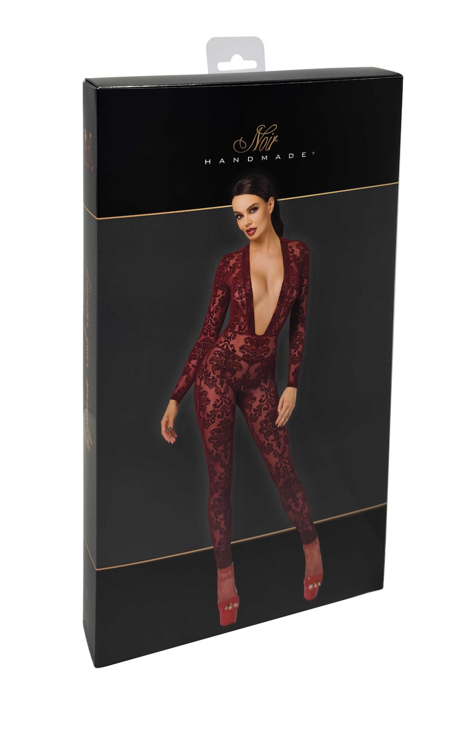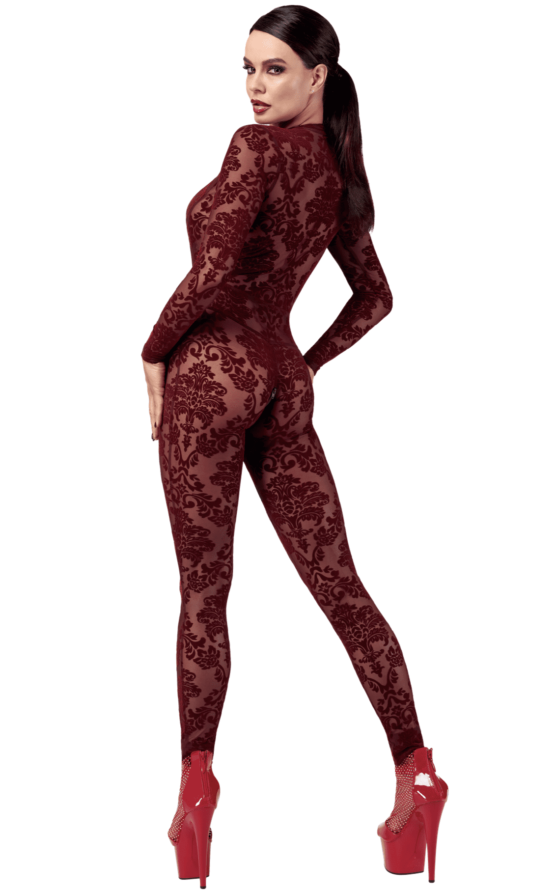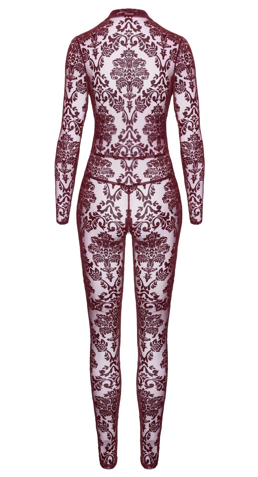 Combinaison en tulle floquée bordeaux. Dotée d une profonde encolure en V, de manches longues et de jambes pleine longueur. Conçu avec une fermeture éclair dans la zone de l entrejambe pour plus de commodité.Matière : 86% polyester, 14% elasthan