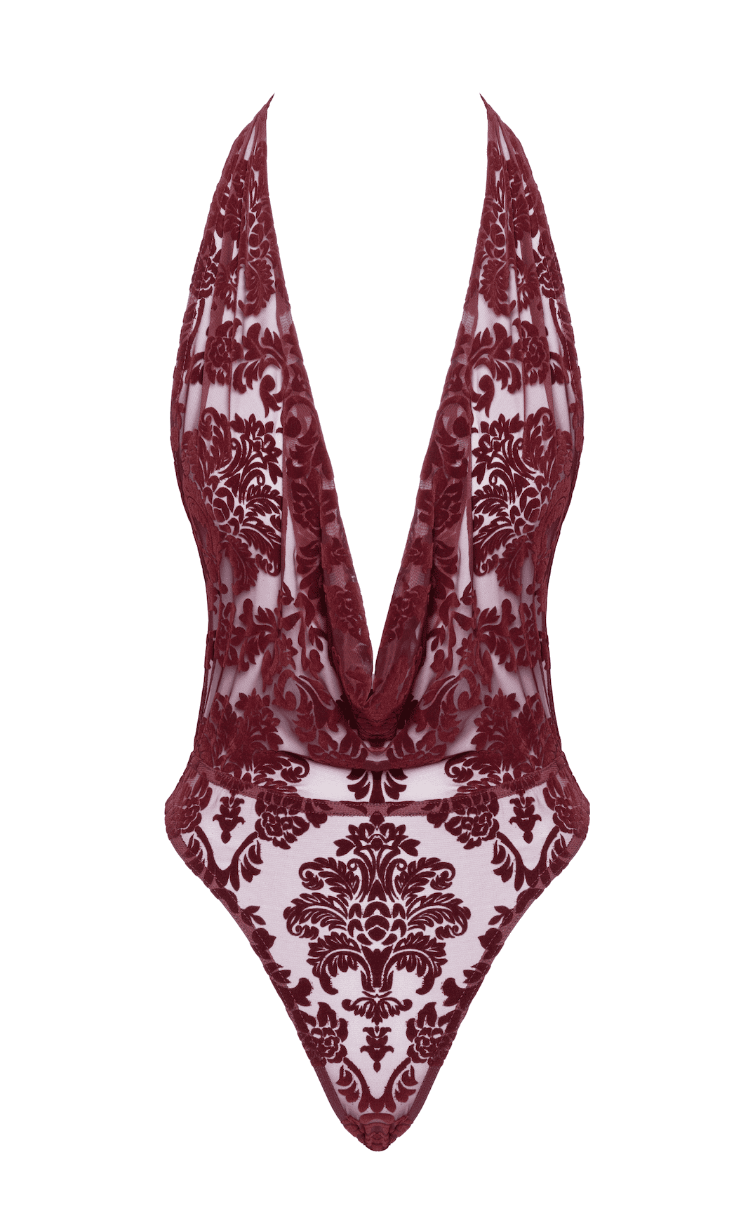 Body en tissu flock bordeaux. Doté d un dos ouvert, d une encolure cowl et d un bas de style string.Matière : 86% polyester, 14% elasthan