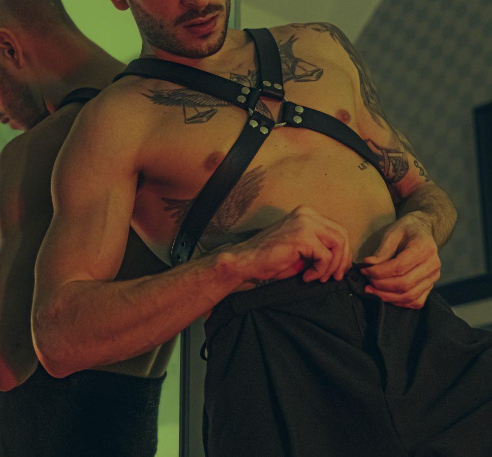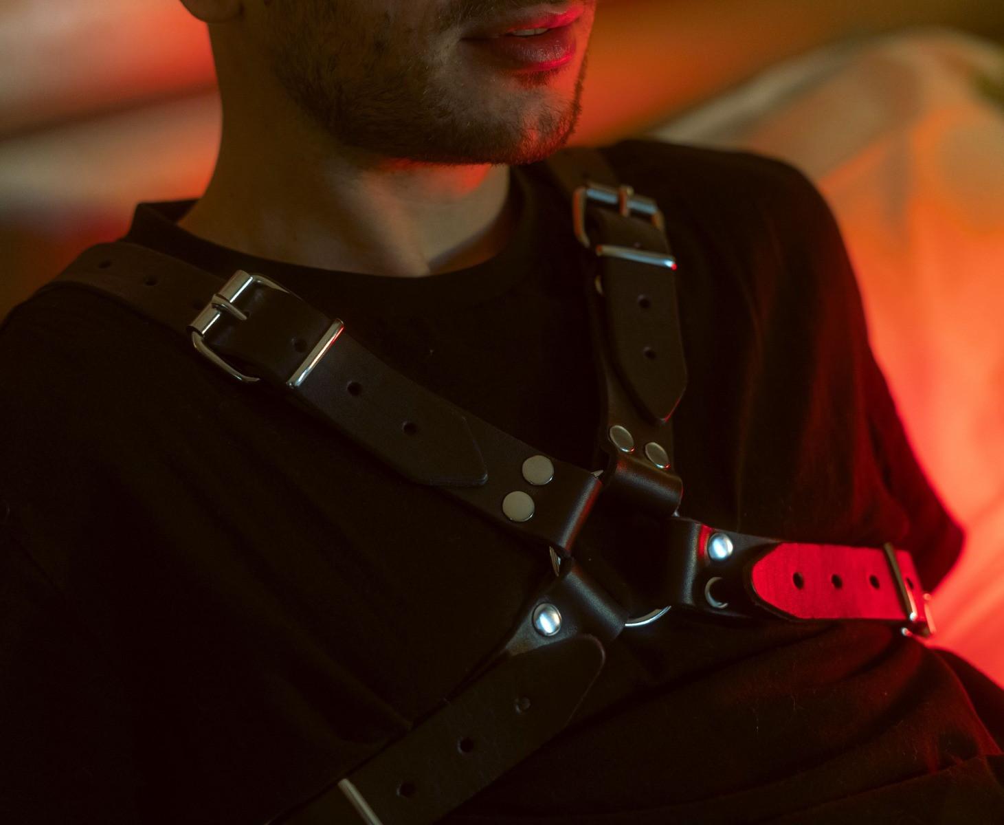 Des bretelles larges qui mettent en lumière le torseCe harnais de buste est fait de lanières larges en cuir épais noir et d'attaches en acier argenté. Chaque lanière est réglable pour s'adapter au mieux à chaque corps. Il vient ainsi se positionner sur le haut du buste pour mettre en lumière les épaules et les pectoraux. Décliné en deux tailles, il est fait pour convenir à tous les corps. Un harnais qui habille le corps du multiples façonsCe harnais se porte de différentes façon pour accompagner vos tenues. Ainsi, il se portera sur un torse nu accompagné d'un short en vinyle ou d'un pantalon en wetlook. Ou bien, il habillera un t-shirt en coton uni ou une chemise en résille. Sa coupe croisée souligne les épaules et habille le corps dans un esprit fétiche. Ses attaches peuvent aussi bien se porter sur l'avant du corps que dans le dos. Un harnais qui devient accessoire de jeuMuni d'anneaux en acier, ce harnais peut aussi bien s'utiliser comme vêtement que comme accessoire de jeu. Ainsi, on pourra le relier à une corde ou une laisse, ou y accrocher une paire de menottes ou un martinet. Il peut alors devenir accessoire de contrainte. Sa matière souple et non-transpirante assure son confort en toute situation.