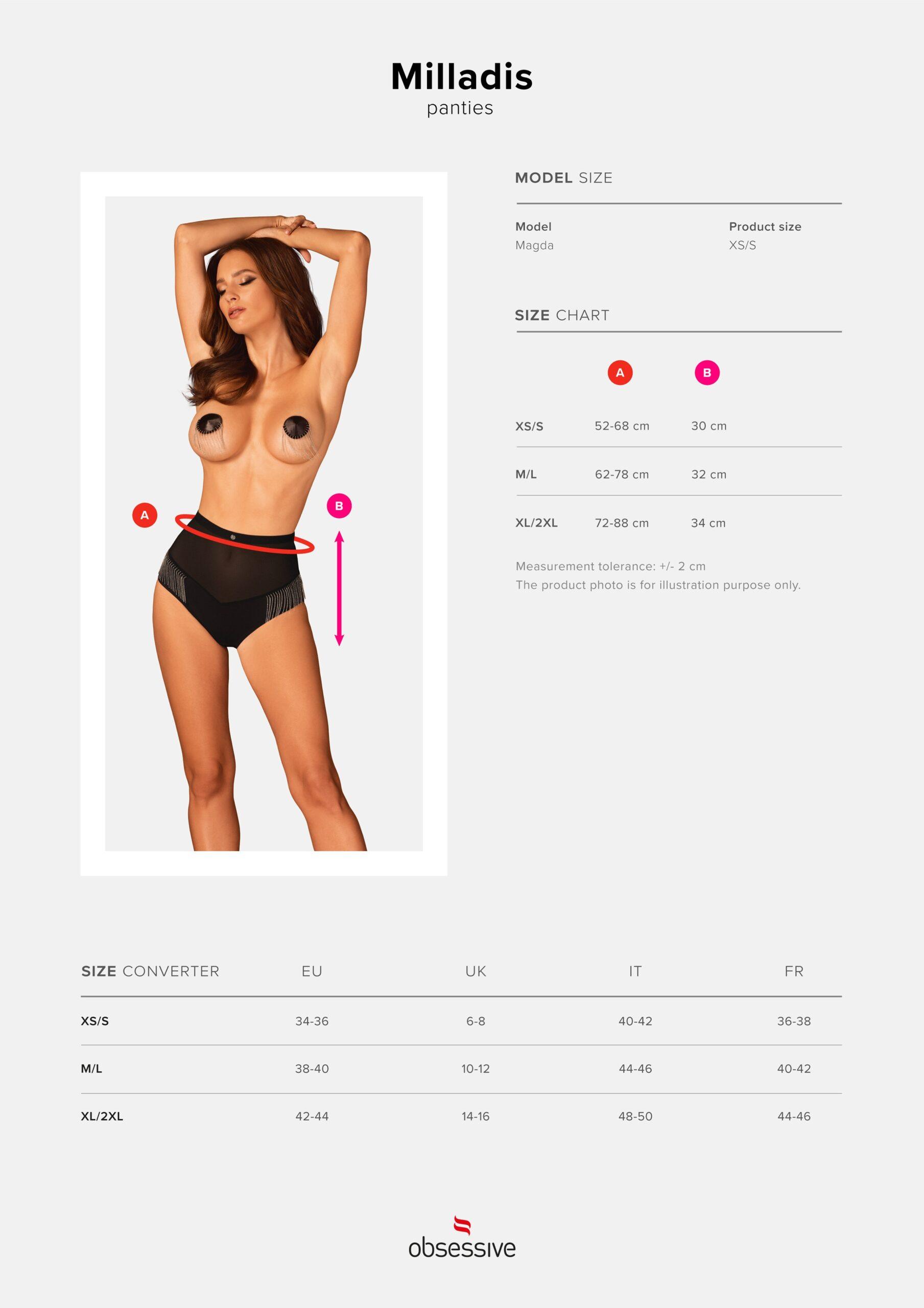 La culotte taille haute de la collection Milladis est un véritable bijou dans l'univers de la lingerie. Une coupe incroyablement sexy et des décorations uniques soulignent parfaitement les courbes et ajoutent du caractère à l'ensemble. Cette conception créera un combo parfait avec des gants et des cache-tétons de la même collection, et vous vous sentirez comme une vraie célébrité puissamment sexy !Découvrez plus de détails :-Culotte taille haute Milladis- maille sexy - révèle doucement le corps et épouse magnifiquement le ventre- pendentif bijou sur le devant - ajoute du charme- rangées de délicates perles argentées sur les côtés des hanches - un ornement unique et intrigant- tissus souples et agréables au toucher (90% polyamide, 10% élasthanne)